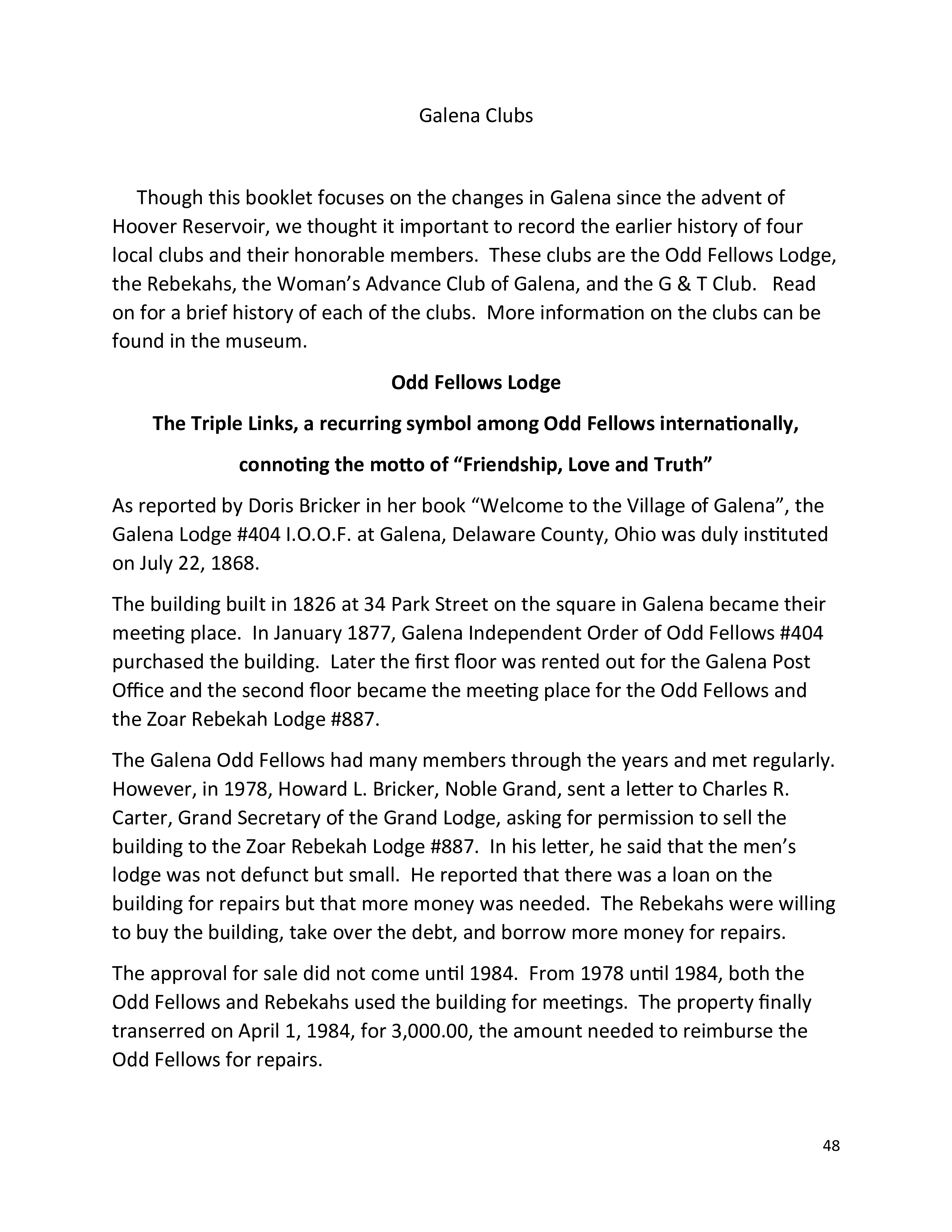 This book follows "Welcome to the Village of Galena," written by Doris Fuller Bricker of Galena, Ohio. "The History of Galena 1952-2002 Including the Impact of Hoover Reservoir on the Village" contains a table of contents with 18 chapters, and full-color photographs in each.